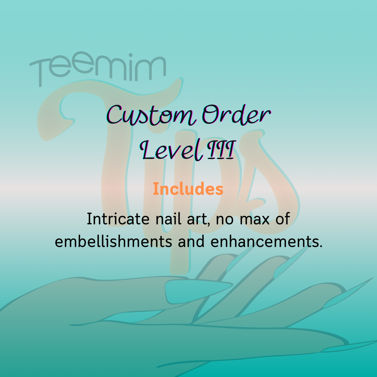 - As we carefully craft each set of custom nails, be aware that the creative process may take longer than our pre-made nails. To ensure perfection, please allow us 7 days to process your uniquely individual set of custom nails.